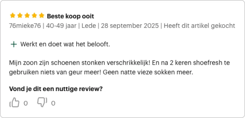 "De voetbalschoenen van mijn zoon ruiken enorm naar kattenpis. Ik word er misselijk van als ik de bijkeuken binnenloop." - Echte Shoefresh klant