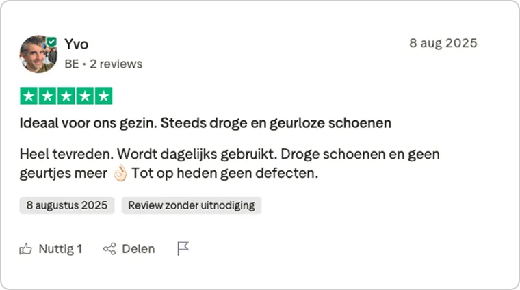 ‘’De hockey en loopschoenen zijn meteen droog en klaar voor opnieuw te gebruiken. Na een kleine maand al zeer frequente gebruikers, wij kunnen niet meet zonder!’’